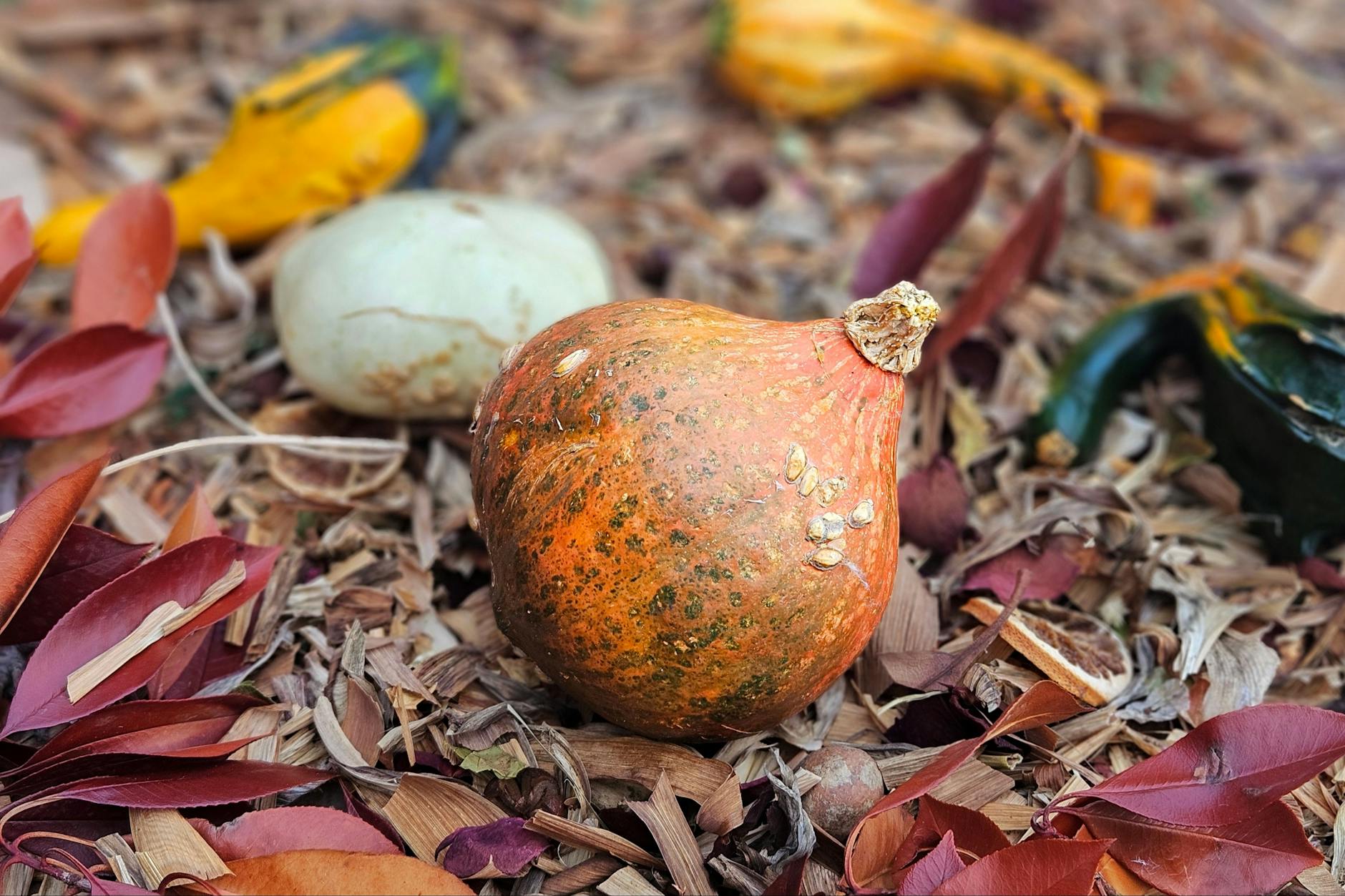 So my last walk that morning was a bit of angry, exasperated defiance just before leaving, and my discovery of a random undestroyed vegetable in a neighboring field became the weird trophy I bore back to her kitchen. It’s a pretty rural development, her new place, so it runs right up against farmlands. It’s why my dream whispers when I’m there. This one has clearly been tilled, and recently. The exposed earth is baked dry and littered with chunked up pumpkins, gourds and squash, the remains of a crop well beyond harvest—the rejects, really, now being turned under. Littered. The pieces no bigger than a cup. Many-colored though, and pretty, darkest greens and rich oranges. Potsherds for as far as the eye could see, sprayed across the broad field right up the the edge of the November woods.